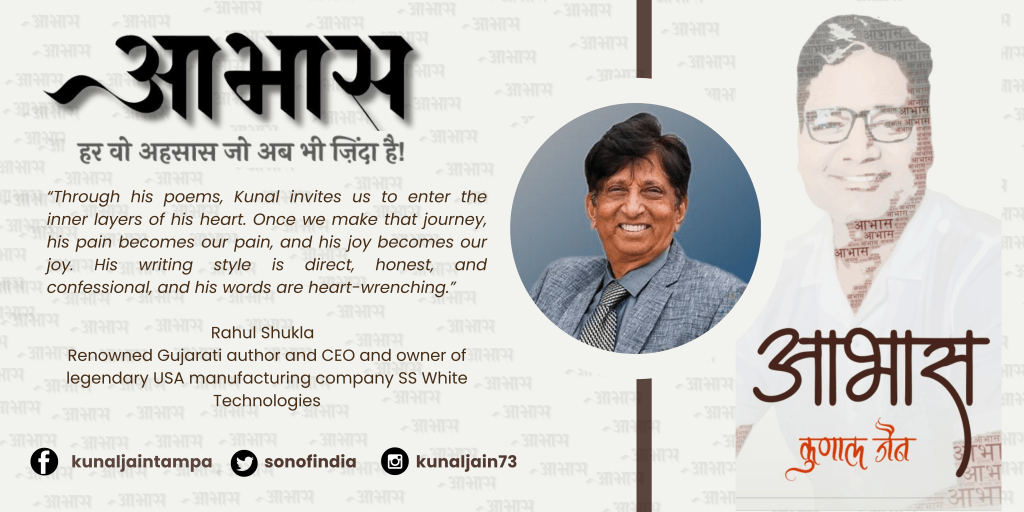 सबसे बड़ी समस्या थी कि इस पुस्तक का शीर्षक क्या होना चाहिए तो मेरे ज़हन में मेरे बेटे आभास का नाम ध्यान आया और यह भी ध्यान आया कि जो भी मैंने इतने बरसों में लिखा है वो आभास ही तो है। बस फिर क्या था वही शीर्षक बन गया। मेरी जीवन में दो अत्यधिक रोचक और रचनात्मक समीक्षक रहे है! एक मेरी पत्नी पारुल और बेटी ईशी जिन्होंने मुझे सिर्फ़ इस बात के लिए प्रेरित किया कि इस जीवन में जो भी सोचूँ और करूँ सिर्फ़ सही करूँ । आशा करता हूँ कि यह किताब उनके मापदंडों पे शायद खरी उतरे? इस पूरी किताब में कई कवितायें और ख़त मैंने सिर्फ़ अपने रिश्तों को बचाने की जद्दोजहद में लिखे है लेकिन मक़सद सिर्फ़ यही था कि में अपनी मन की आवाज़ को क़ैद में नहीं रखना चाहता था। चाहे फिर वो माँ को लिखे ख़त हो या बेटी के लिए लिखी कविताये हो? सभी में आपको मेरी सच्चाई ही दिखाई देगी। ईसी आशा के साथ आपको मेरे कुछ आभास प्रस्तुत करता हूँ।